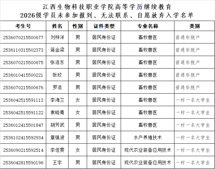 江西生物科技职业学院高等学历继续教育2026级学员报到注册工作已结束,目前还有11名录取新生存在未参加报到、无法联系、自愿放弃入学的情况。根据“江西生物科技职业学院高等学历继续教育学生手册”有关规定,按自动放弃入学资格处理。现对11名学员名单予以公示: